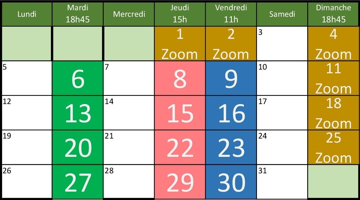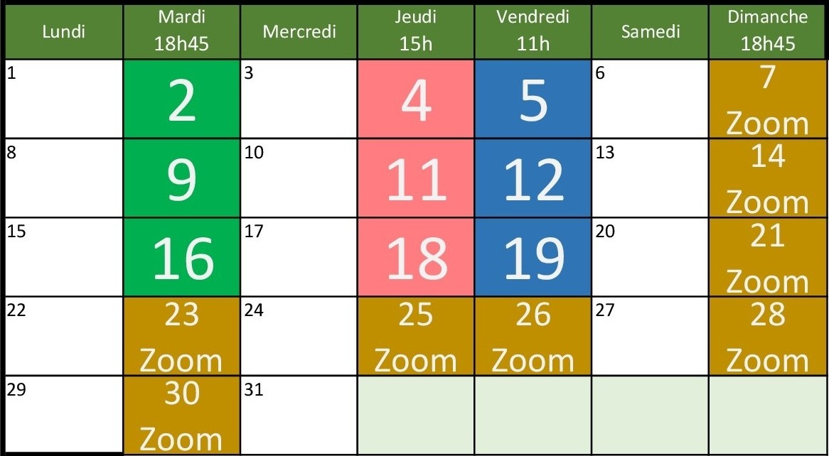 Prochaines dates en présentiel jeudi 4 décembre 2025 à 15h vendredi 5 décembre 2025 à 11h mardi 9 décembre 2025 à 18h45 |